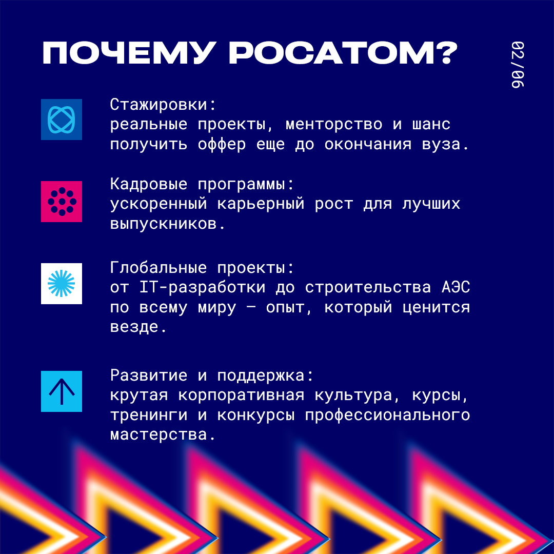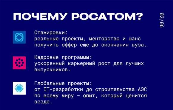 Мечтаешь о работе в одной из самых высокотехнологичных корпораций страны? Росатом — это не только атомные станции, но и IT, медицина, новые материалы, логистика и даже космос! И у молодежи здесь огромные перспективы. Смотри, с чего можно начать.