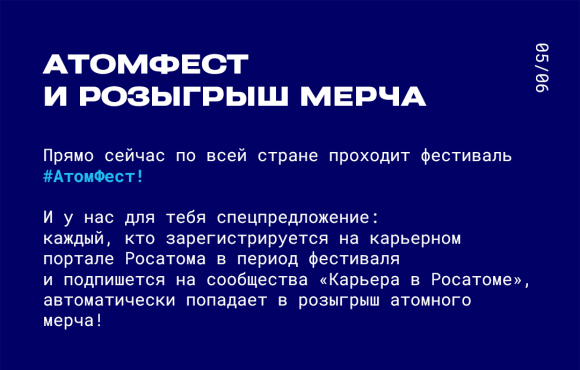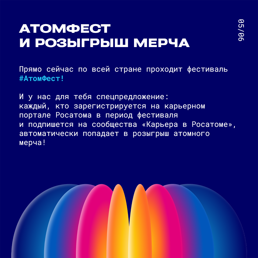 Листай карточки, регистрируйся на карьерном портале Росатома, принимай участие в фестивале #АтомФест и участвуй в розыгрыше — сделай первый шаг в карьере в атомной отрасли!