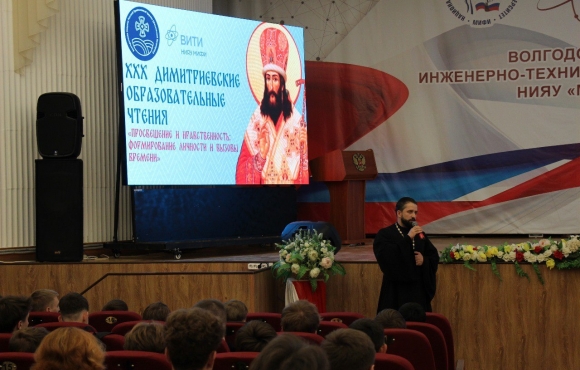 В мероприятии принял участие и обратился к присутствующим в зале студентам Иерей Николай Соловьев, настоятель храма Донской иконы Божией Матери в г. Волгодонске.