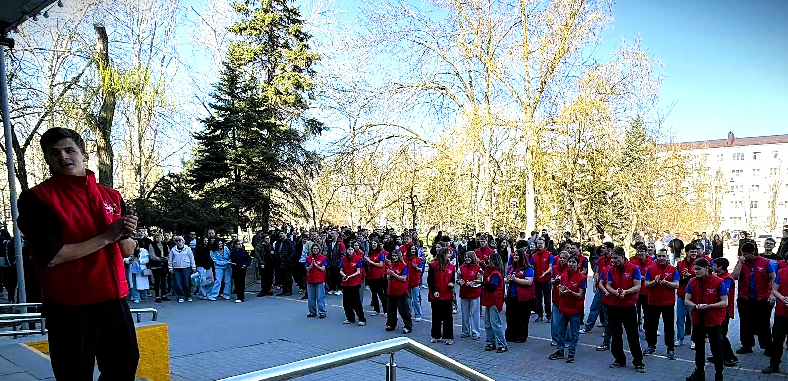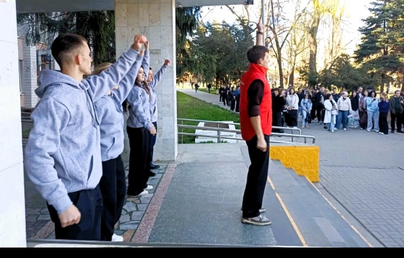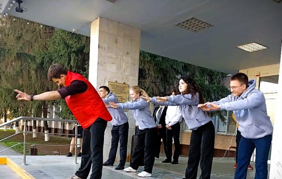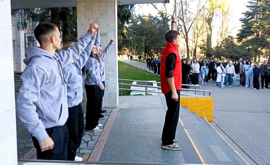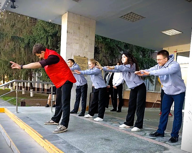Спортивное занятие организовали на открытом пространстве, возле входа в главный корпус вуза, а провел его председатель студенческого спортивного клуба Данила Теряев.
