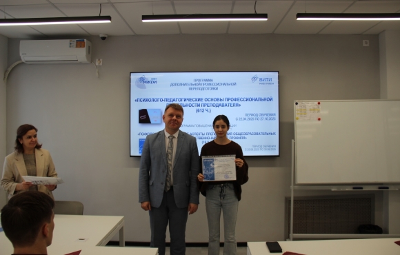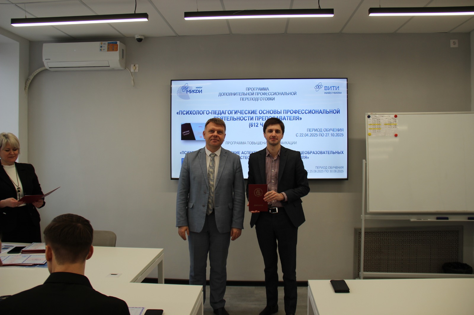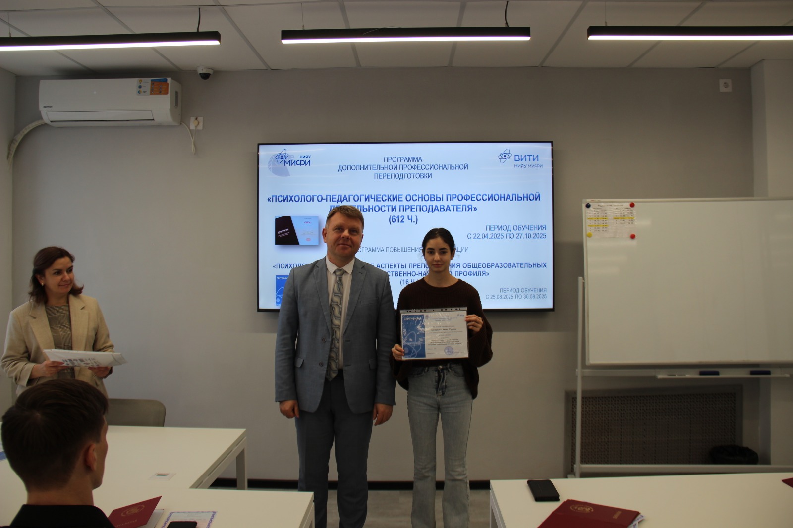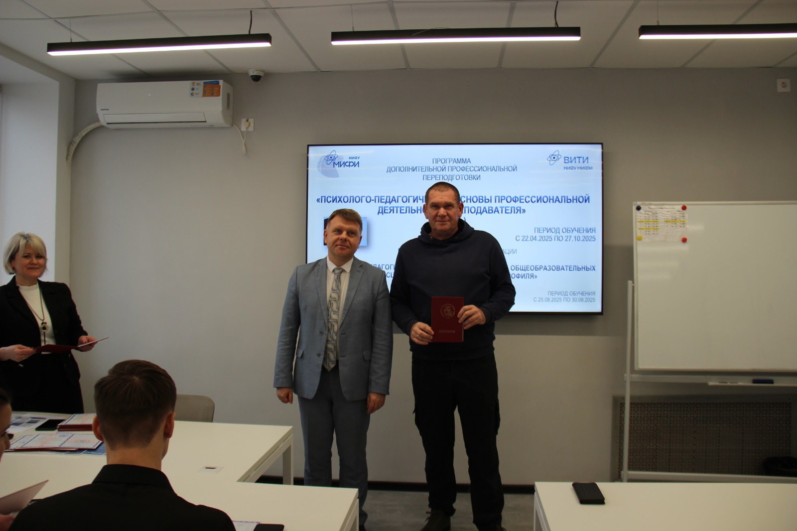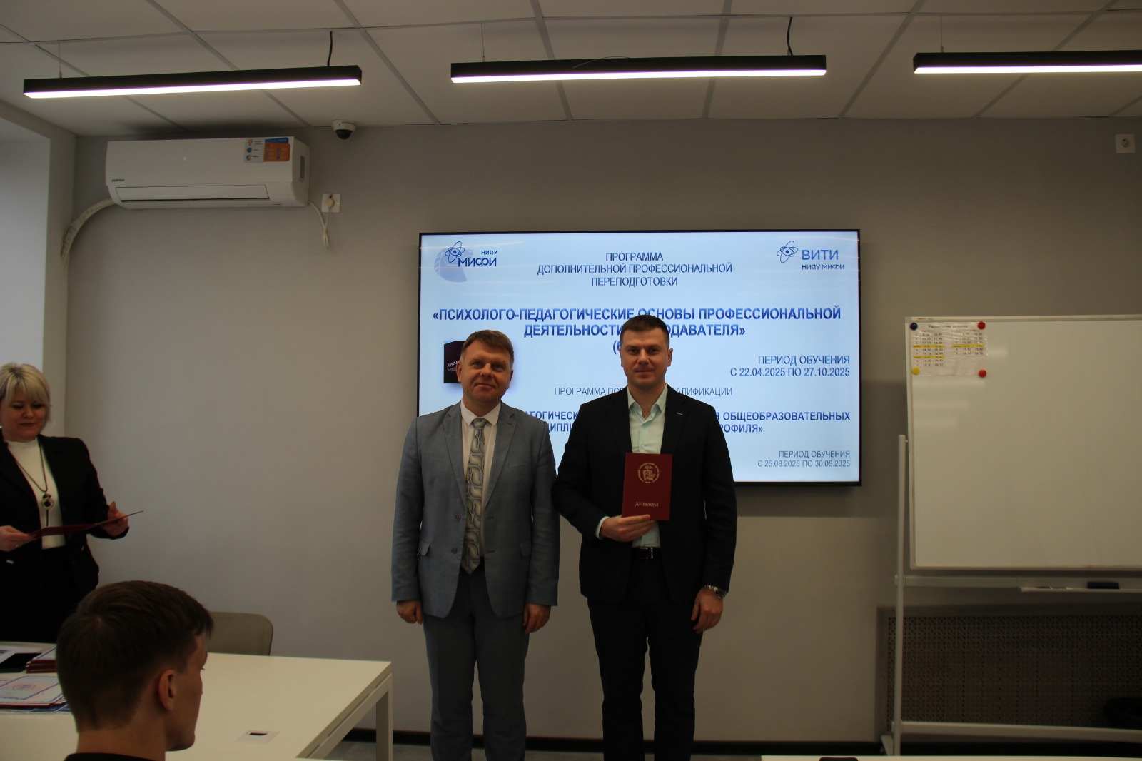 В этот день особую чествовали 24 преподавателей вуза и техникума ВИТИ НИЯУ МИФИ. Получив дипломы о профессиональной переподготовке, они теперь обладают не только своим основным профессиональным высшим образованием, но и высокоуровневой педагогической квалификацией.