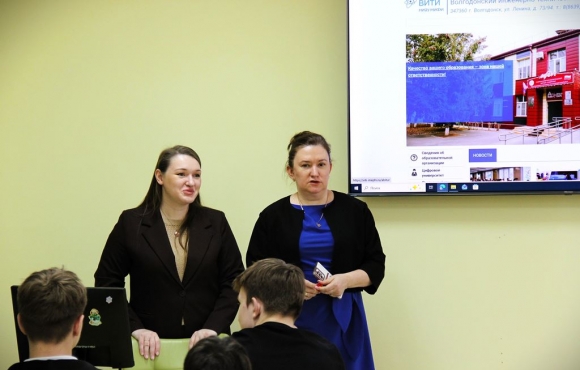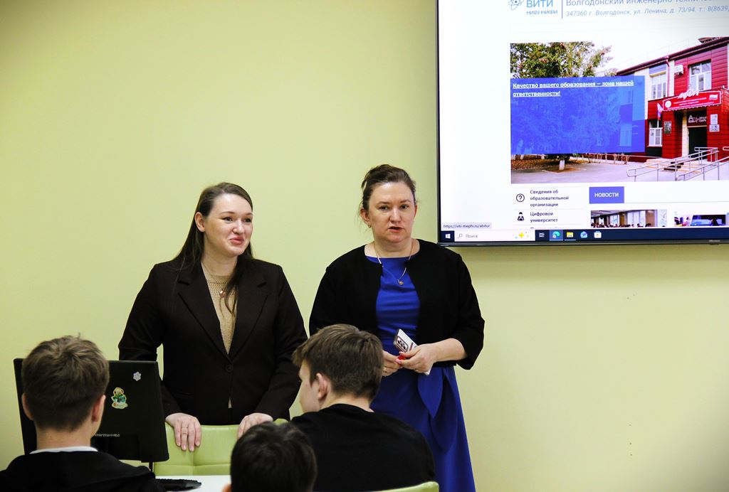 Ответственные секретари приёмных комиссий института и техникума выступили с презентацией, рассказали об особенностях приёмной компании в 2026 году, практике и перспективах трудоустройства после окончания вуза.