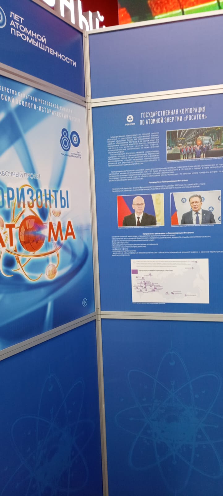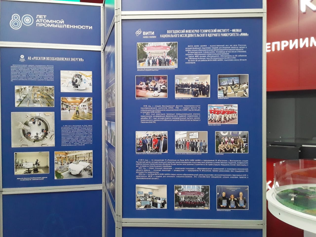 ВИТИ НИЯУ МИФИ также был представлен на выставке в фотоматериалах стенда от Волгодонского эколого-исторического музея, посвященного нашему атомграду в разрезе 80-летия атомной промышленности, которое страна отмечает в 2025 г.